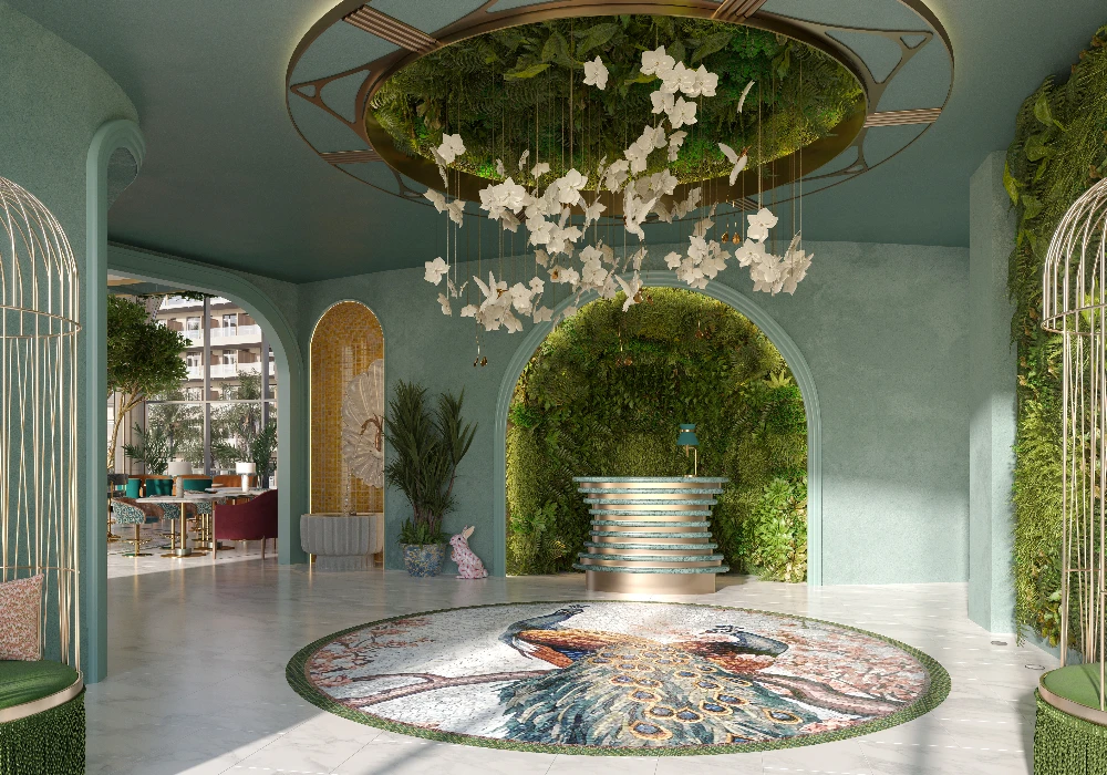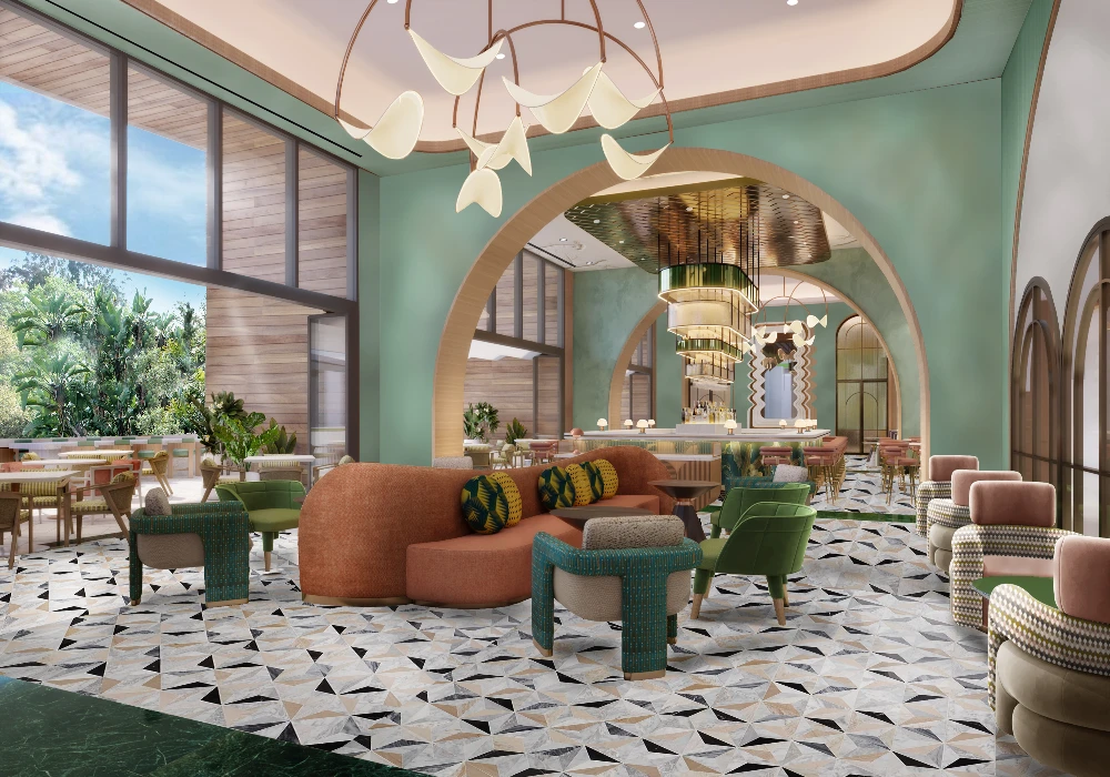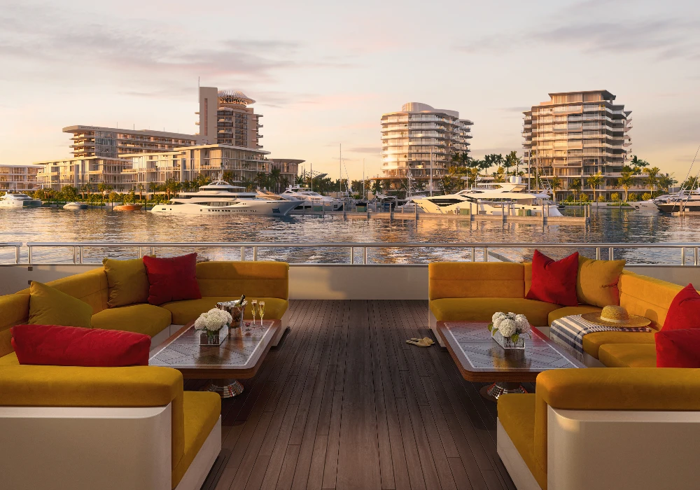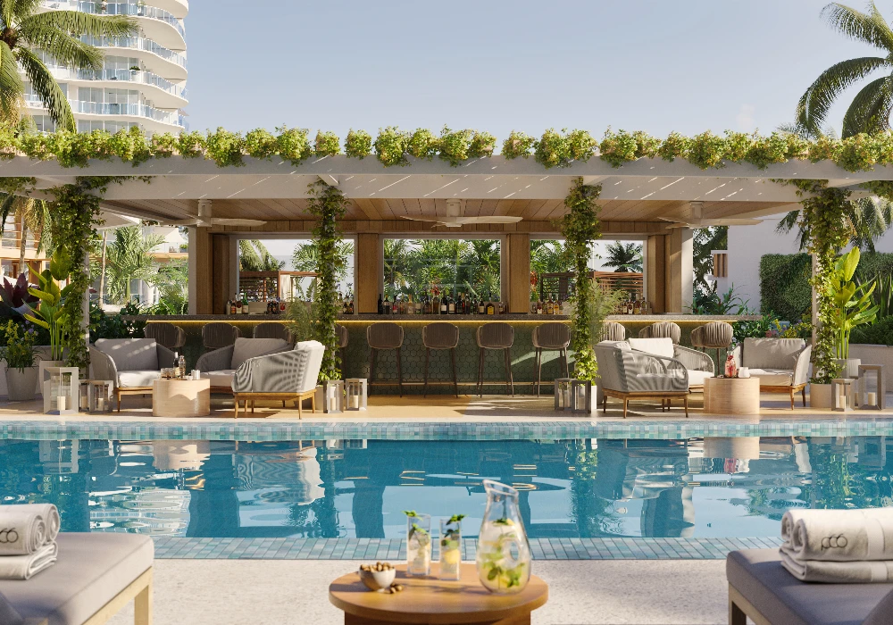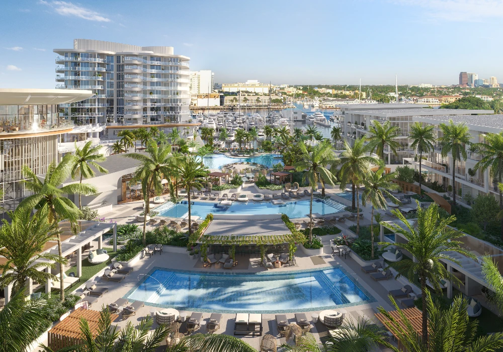 • Dynamic, multi-level, marina-front pool deck with tropical landscaping, cabana seating, art installations, entertainment, and food and beverage offerings: