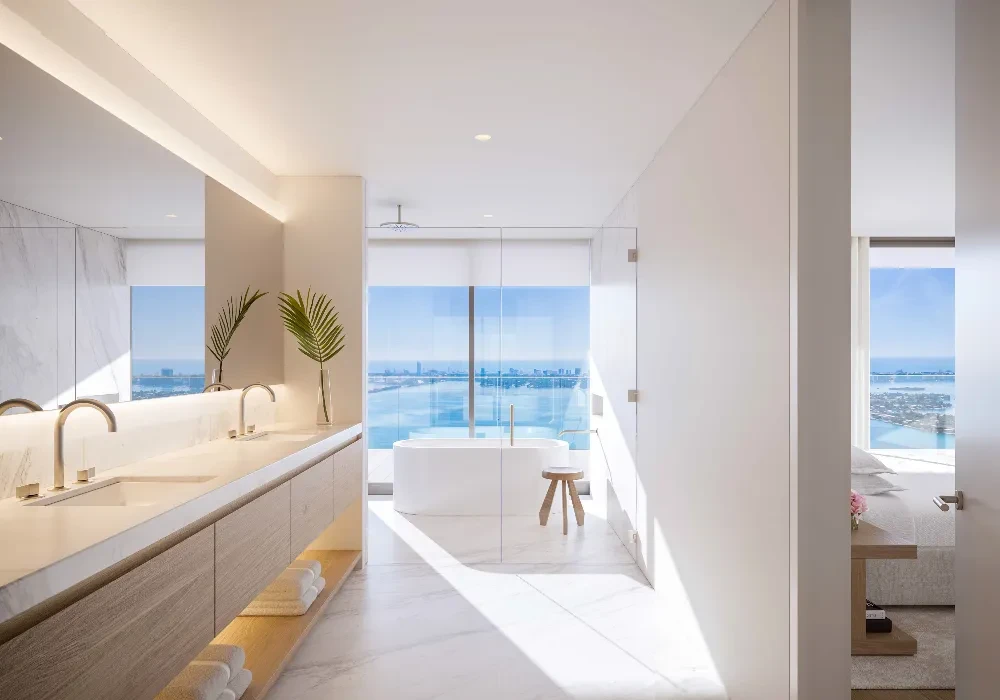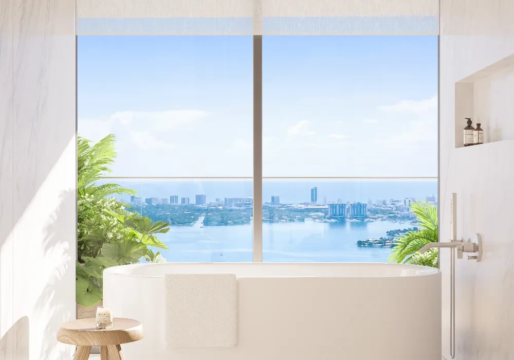 » Custom free-standing tub positioned along floor-to-ceiling glass window overlooking Biscayne Bay.